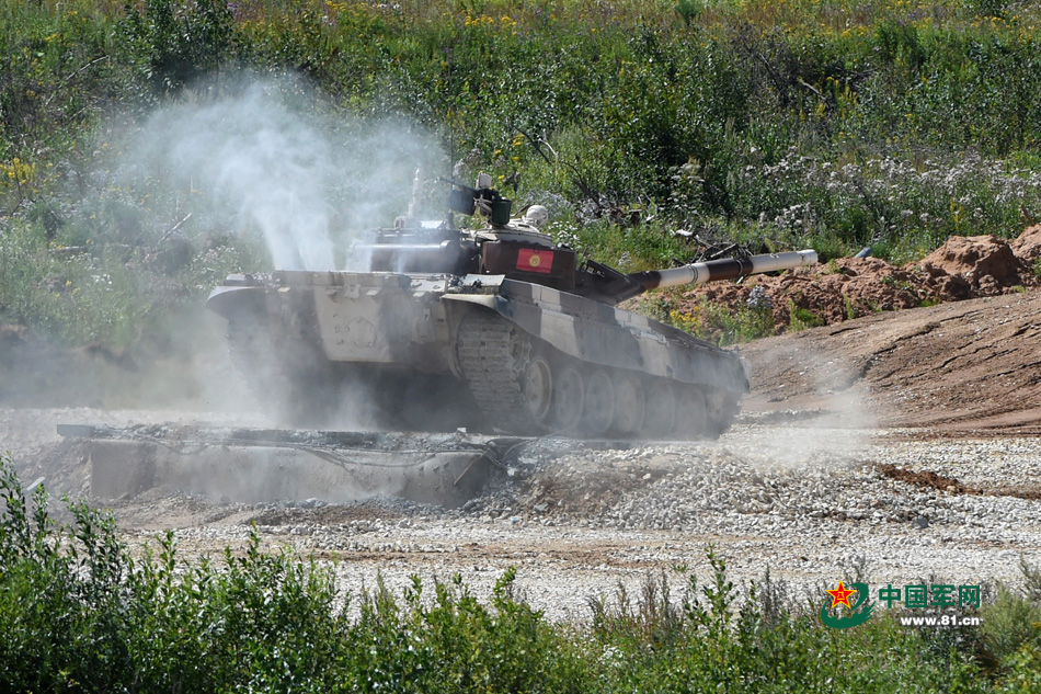 吉尔吉斯斯坦的参赛坦克通过崖壁障碍后准备进入第二个侧倾路段。特约记者