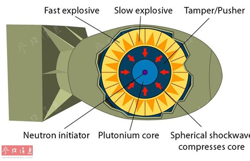 由于钚的自发中子比铀多很多,用枪式起爆方式容易产生过早点燃现象。内爆式起爆原理是将处于低临界的球形钚,放置在空心的球状炸药内。周围接上32枚同时起爆的雷管。雷管接通起爆后,产生强大的内推压力,挤压球形钚。当钚的密度增加至超临界状况,引发核裂变。内爆式原子弹爆炸效率高,可以用钚可作为装料。图为内爆式原子弹起爆原理。