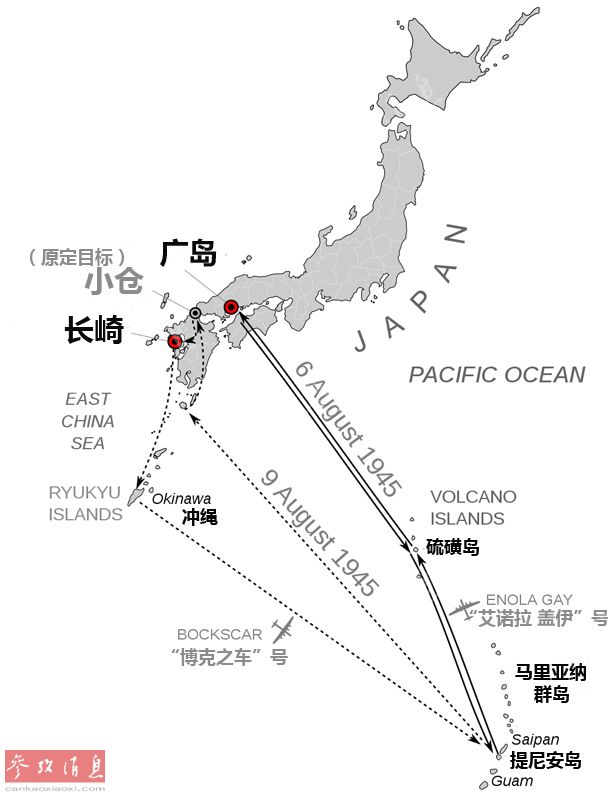由于”三位一体“试爆时,纳粹德国已投降,为了避免盟军直接登陆日本本土可能产生的巨大伤亡,时任美国总统的杜鲁门决定对日本使用原子弹。图为美军B-29轰炸机进行两次核轰炸的航线示意图。