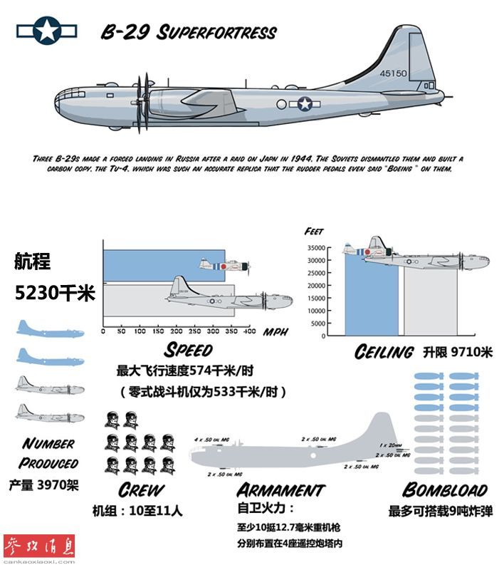 鉴于当时原子弹的重量和轰炸航程,只有B-29“超级堡垒”轰炸机的性能能够胜任这一任务。图为B-29性能示意图。