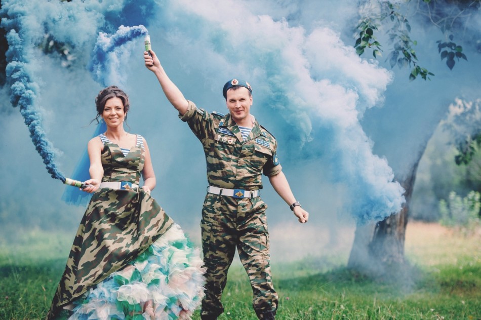 近日,有外国网友上传了一组俄罗斯空降兵特色的婚纱照。在图片中,帅气的新郎和美丽的新娘身穿迷彩服和俄军空降兵必备的海魂衫,拍摄出了既有军事色彩又浪漫唯美的婚纱照。这套婚纱照纪念了空降兵的爱情也诠释了战斗民族尚武的性格。(鸣谢 鼎盛军事论坛)