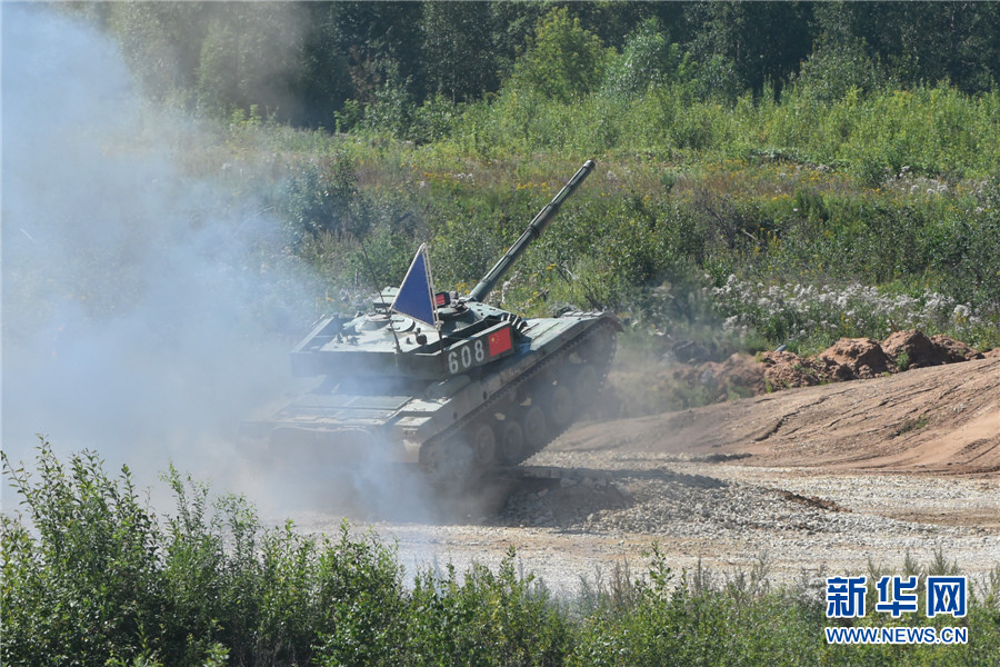 中国军队参加“坦克两项”单车赛的车组,以过硬的技能和密切的配合,顺利克服了超过装备性能极限的障碍。图为96A坦克越过崖壁障碍 (吴苏琳 摄)