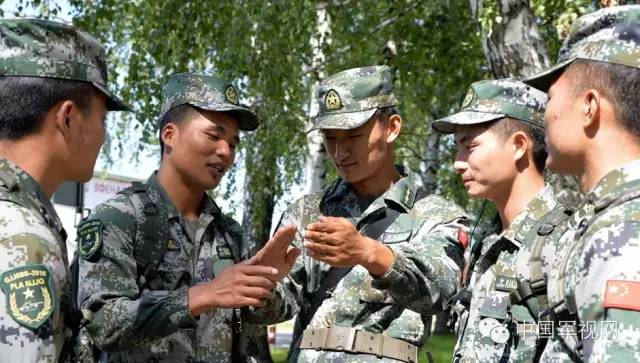 中国军队参加“坦克两项”竞赛的代表队成员在赛场交流操作体会。