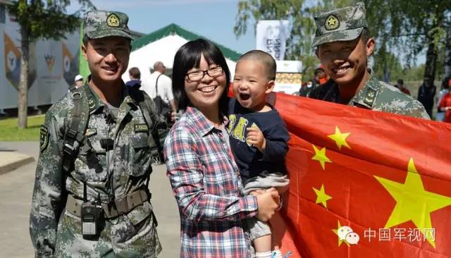 许多中国在俄罗斯工作的人员和游客以极大的热情前来观赛。图为观众和“坦克两项”参赛士兵合影。