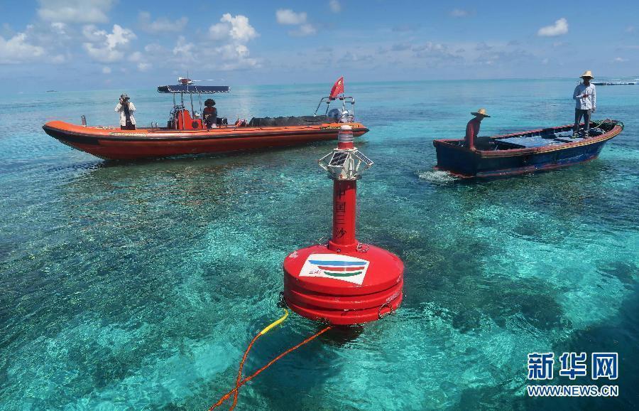 8月4日,南海航海保障中心西沙航标处驻永兴岛工作人员在赵述岛入口航道投放一红一绿两个灯浮标,为进出赵述岛的船舶指明航路,规避触礁风险。图为工作人员在海南省三沙市赵述岛入口航道投放的一个灯浮标。新华社发(傅建斌 摄)