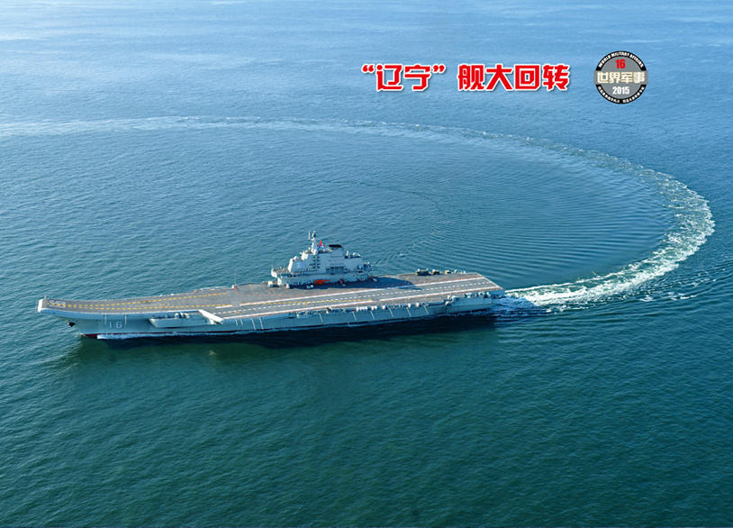 《世界军事》2015年第16期中插图片中曝光了一张中国海军“辽宁舰”海上小半径急转弯的最新图片,从图片中我们可以看出辽宁舰有着较好的机动性,海上“大回环”转的干净利索。(鸣谢 《世界军事》)