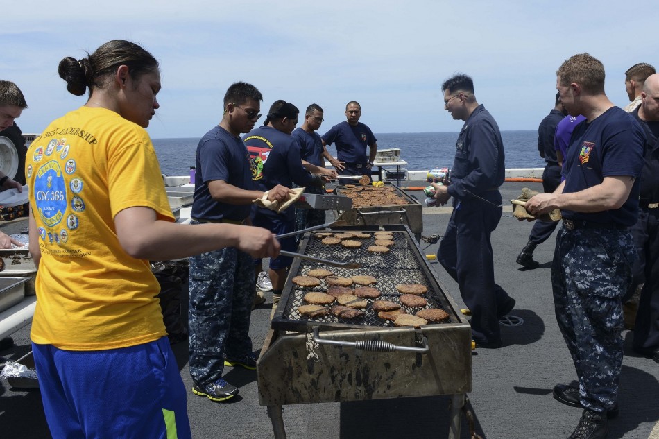 本图集为2015年8月5日,正在印度洋上执行部署任务的美国海军LHD-6好人理查德号两栖攻击舰上正在举行甲板烧烤派对。
