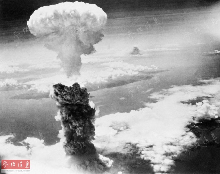日本当地时间8月9日上午11点02分,”博克之车“号在长崎上空9100米投下”胖子“,后者在离地500米起爆,约3.5万人直接死于此次原爆,另有6万人受伤。图为1945年8月9日,长崎上空升起的蘑菇云。