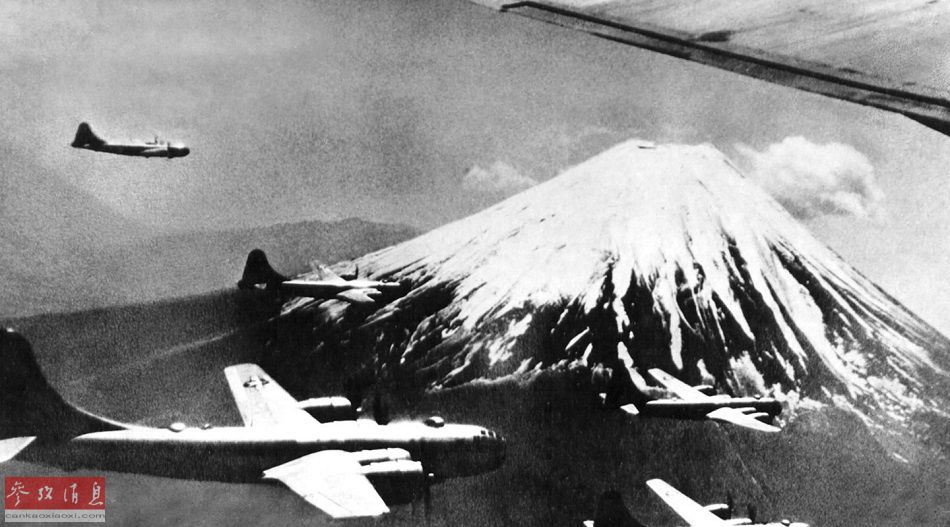 图为1945年,飞越富士山的B-29机群,由于目标明显,富士山是当年美军空袭编队的理想集结点。