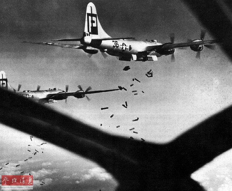 图为第468轰炸机大队的B-29投弹瞬间 ,1945年。