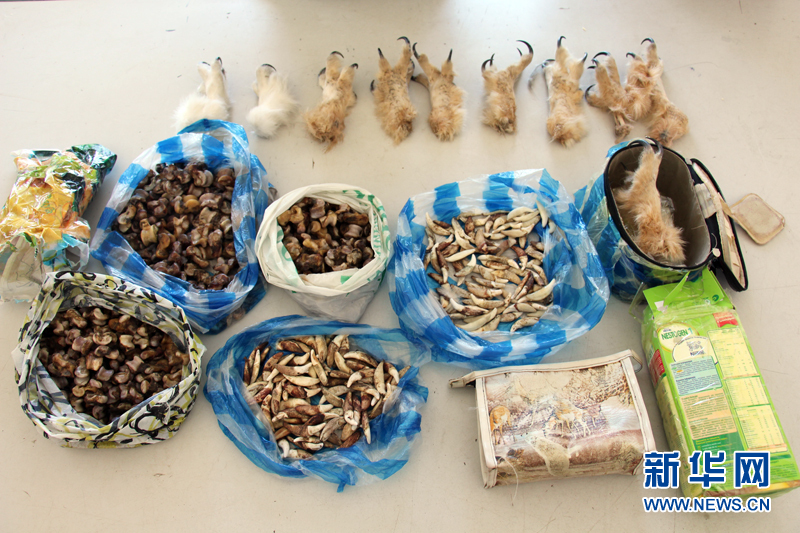 6日,新疆边防总队塔克什肯边检站成功破获一起珍稀濒危动物制品走私案,缴获狼牙167颗,狼髀石345块,猫头鹰鹰爪5对,涉案价值达50万元。