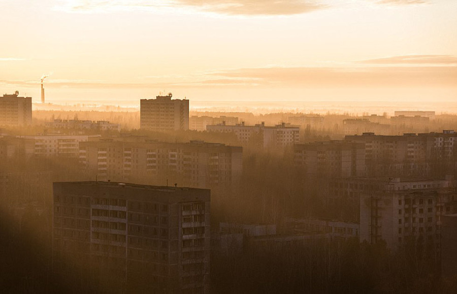 在这里驻留一夜后,太阳从普利皮亚特建筑房顶升起。(网页截图)