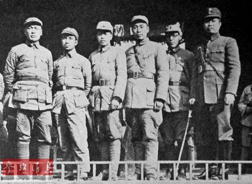 1939年,周恩来(右三)在皖南泾县新四军军部和新四军领导人叶挺(右一)等同志合影。(资料图片)