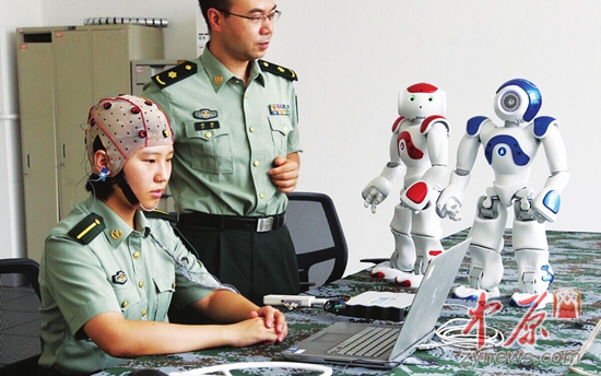 实验台宽大的桌面上,安安静静地站着一蓝一红俩机器人,近半米高,突然,其中蓝色的小人儿开始前进、左转,并作出弯腰、摇头等动作。“我能够通过意念来控制机器人进行一些动作。”实验室一名学生的头上戴着一顶造型奇特的帽子,“无声的指令”正是通过这个帽子发出的。