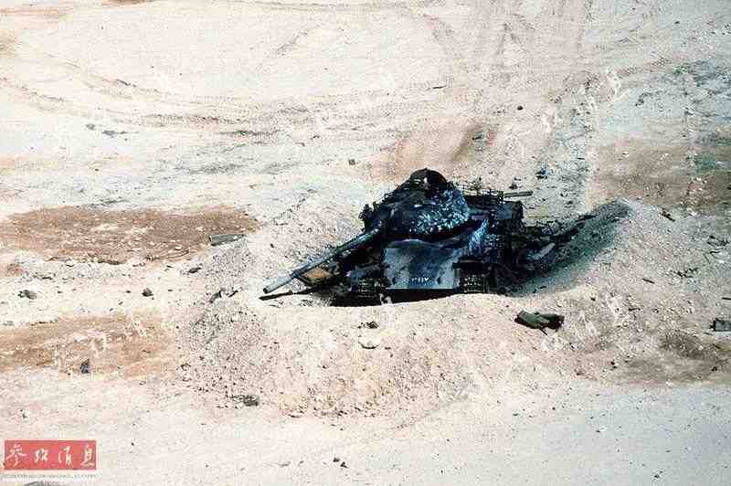 图为1991年2月7日拍摄的,被多国部队空袭摧毁的伊军T-54A(或59式)坦克。