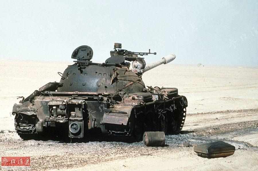 图为1991年2月28日拍摄的,被联军空袭摧毁的伊军69式坦克。