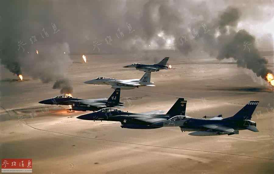 图为沙漠风暴期间,美空军的F-16C、F-15C战斗机与F-15E战斗轰炸机编队飞行,背景为被伊拉克陆军点燃的油井。