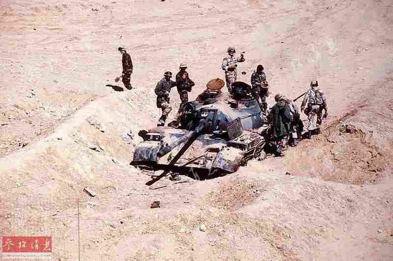 图为法国陆军士兵和美军士兵一同检查被法国陆军第6轻装甲师击毁的伊军69式坦克。