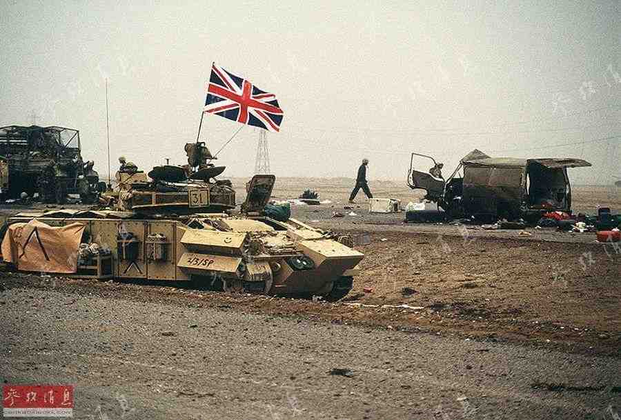 图为隶属于英国陆军第7装甲旅的一辆武士步兵战车在伊军从科威特城撤退后,在通往巴士拉的高速公路上升起了英国国旗,摄于1991年2月28日。