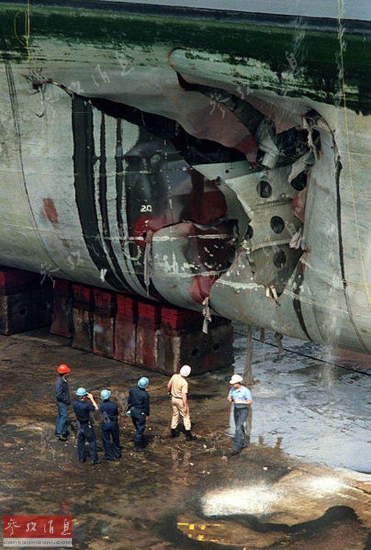 图为1991年2月1日,美军修理人员正在检查被伊军水雷炸伤的的黎波里号扫雷母舰(LPH-10)。
