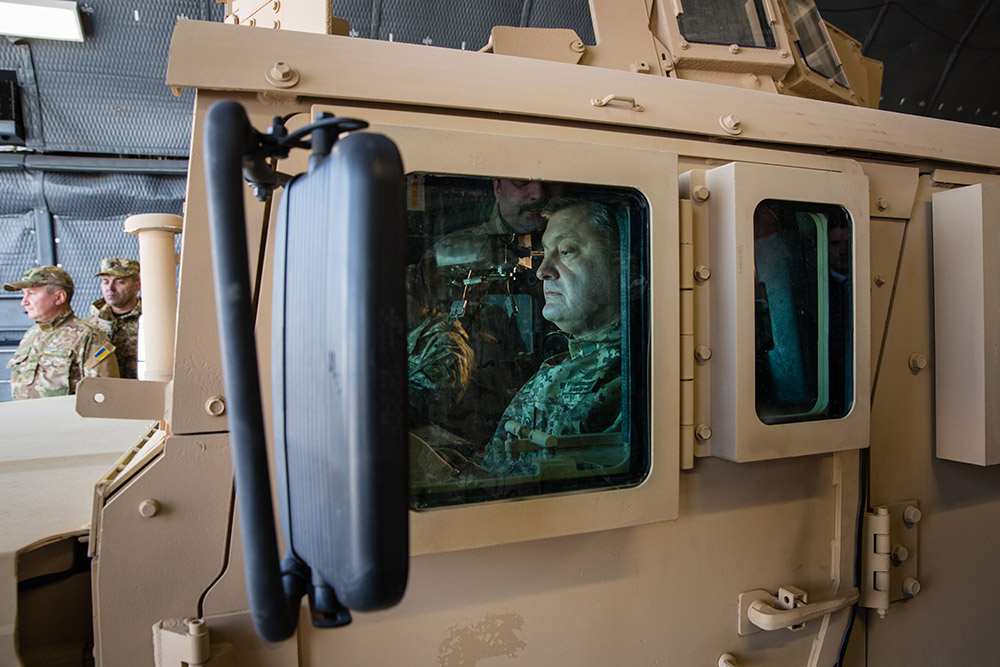 当地时间3月25日,乌克兰鲍里斯波尔机场,美国向乌克兰提供的非致命性武器一架飞机和10辆悍马车抵达当地机场,波罗申科出席了欢迎仪式。
