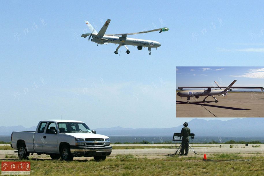 下面来看看埃尔比特公司的代表作,首先是“赫尔墨斯”450 MALE无人机,其最大续航时间为30小时,虽不如IAI的“苍鹭”(50小时),但单价仅200万美元,仅为后者的五分之一,因此颇受中小国家的青睐,现已出口装备12个国家的军队,美国海关也是该机的用户 。 图为2004年6月,美国海关试飞赫尔墨斯450无人机。