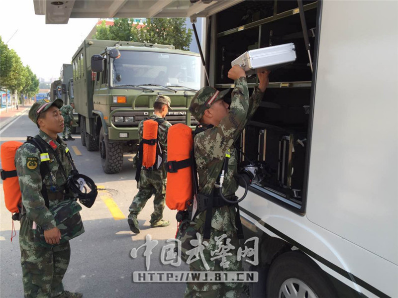 中国军网8月13日电据解放军报法人微博“军报记者”消息,天津港危险品仓库爆炸事故发生后,武警8630部队立即启动应急响应机制,直属工化营洗消车、水炮车等20台车辆,400名兵力携带生命探测仪、切割机等设备,做好赶至事发现场参加抢险救援的准备。(张文犀、记者张海华)