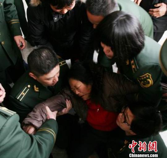 2013年元旦,浙江杭州萧山一场无情的大火肆虐了近12小时才被扑灭,杭州消防支队萧山中队特勤分队分队长尹进良、萧山中队陈伟、萧山市北中队尹智慧3名攻坚组官兵不幸罹难。图为悲伤欲绝的陈伟母亲。 李晨韵 摄