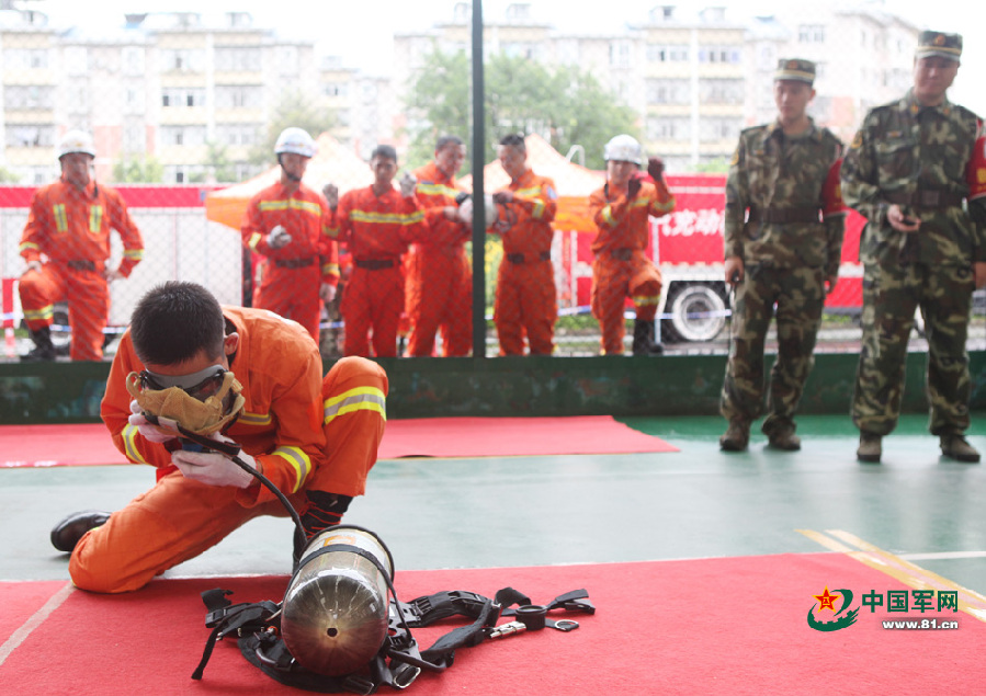 图为武警重庆市消防总队官兵进行正压式空气呼吸器拆解组装。