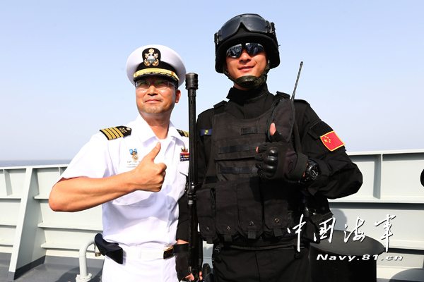 韩海军第二十九批护航编队指挥官、“李舜臣”号驱逐舰舰长俞在万向济南舰随舰特战队员竖起了大拇指。代宗锋 摄