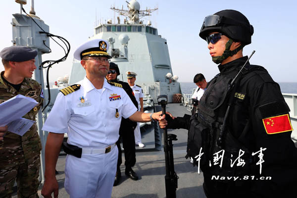 韩海军第二十九批护航编队指挥官、“李舜臣”号驱逐舰舰长俞在万在观摩我随舰特战装备展示时与特战队员交流。代宗锋 摄
