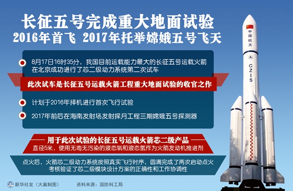 长征五号运载火箭由航天科技集团公司中国运载火箭技术研究院抓总研制,计划于2016年择机进行首次飞行试验,2017年前后在海南发射场发射探月工程三期嫦娥五号探测器。