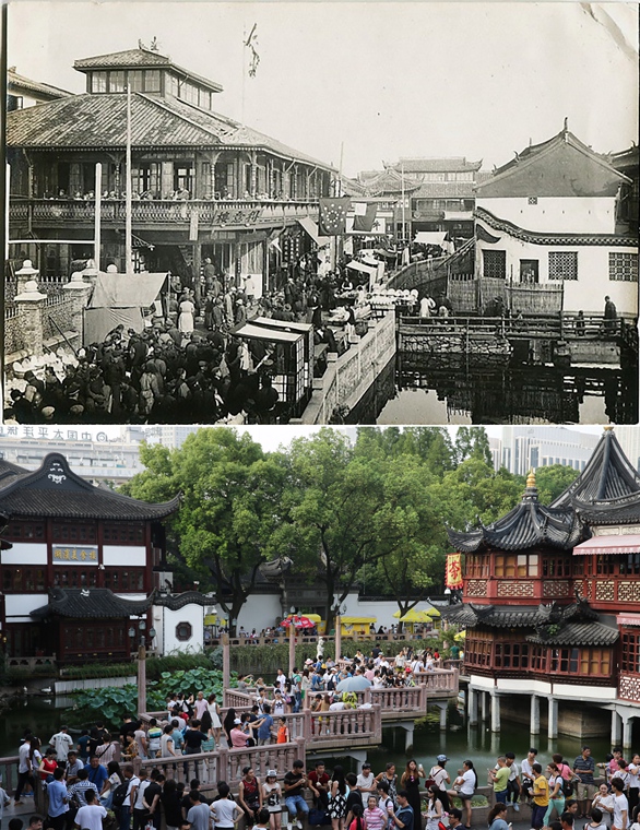 1938年前后的豫园挤满难民(上,资料照片),如今的豫园游人如织(下,8月12日摄)。新华社记者