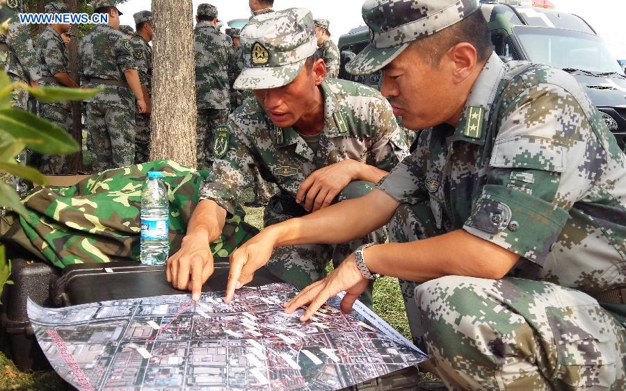 Soldiers of National Nuclear Biochemical Emergency Rescue Team prepare to launch a rescue mission at the core area of explosion site in Tianjin, north China, Aug. 15, 2015. Death toll rose to 85 as of Friday night, including 21 firemen, from the massive warehouse explosions hitting north China's Tianjin City Wednesday night, the rescue headquarters said Saturday. Meanwhile, 721 others were hospitalized, including 25 critically wounded and 33 in serious condition. (Xinhua/Xu Zhuangzhi)
