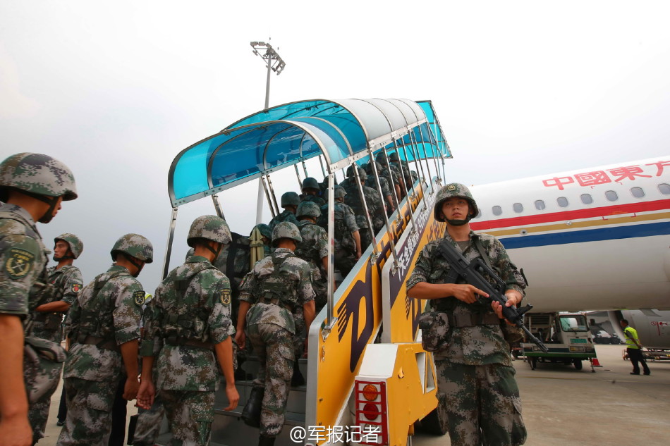 8月15日,广州军区利用路运、铁运、空运三维一体的形式对参加演习的部队进行远程输送,有效提高了部队远程机动能力。於晨摄