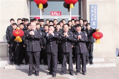2014年过年,当时五大队的31位消防员在大队办公楼前合影。