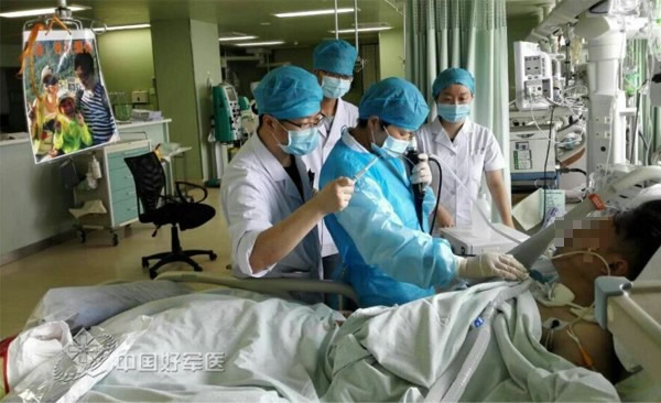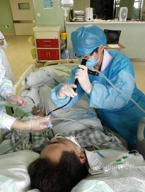 王主任手持支气管镜为伤者清理呼吸道