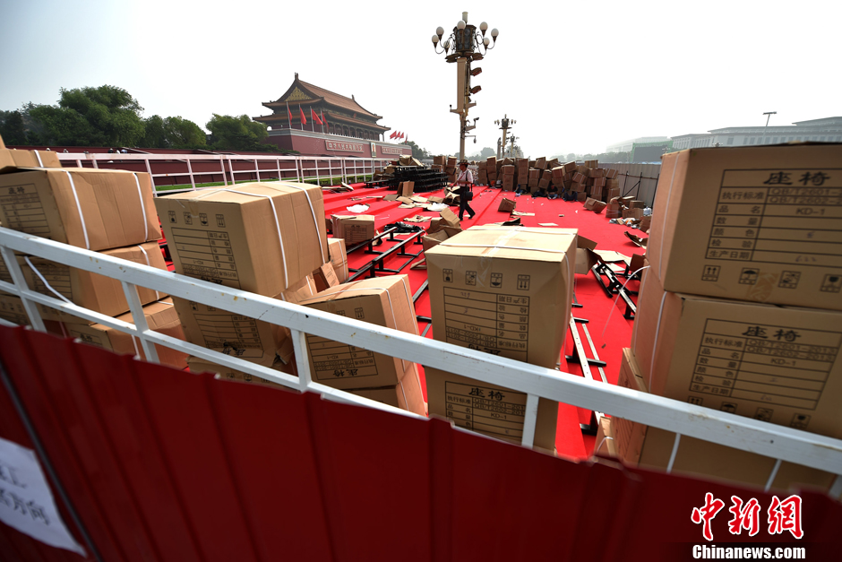8月11日,北京天安门城楼前东西两侧竖起的红色围挡内,工人们正在搭建阅兵临时观礼台。据了解,这是为迎接抗战胜利70周年纪念日的到来进行的“9·3阅兵式”而搭建的临时观礼台。