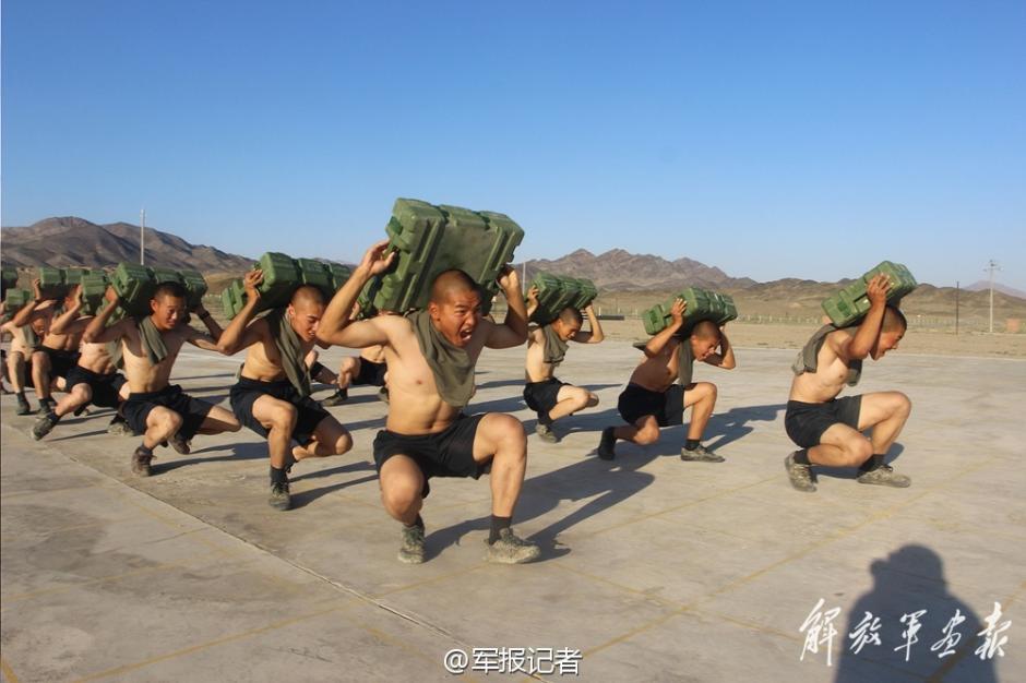 为提高官兵训练热情,8月中旬,新疆阿勒泰军分区某边防连野外驻训时,围绕“练什么”“怎么练”“练到什么程度”的思路,利用现有器材,创新体能训练方法,开展长跑训练、负重单杆训练、负重“鸭子步”训练、负重跳跃训练、负重俯卧撑训练等,提高训练效果。(杨子周、杨立业)