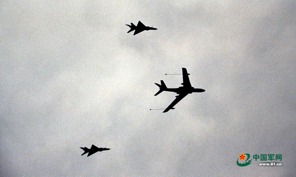 1999年国庆50周年阅兵,加受油机梯队编队飞行训练。