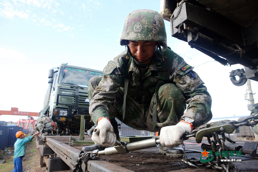 铁路输送前,官兵正迅速对装备进行加固。