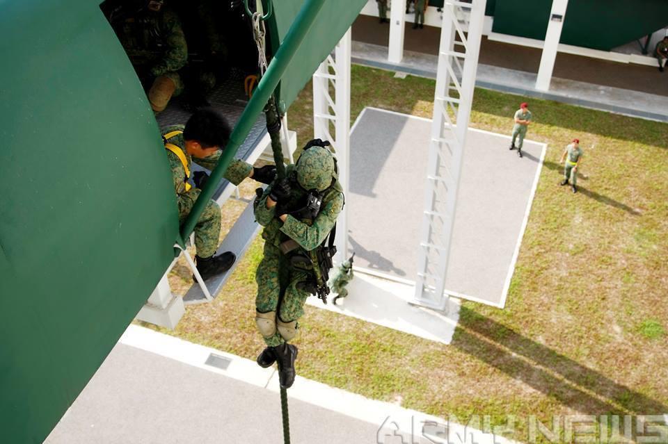 新加坡士兵进行模拟直升机垂降训练。