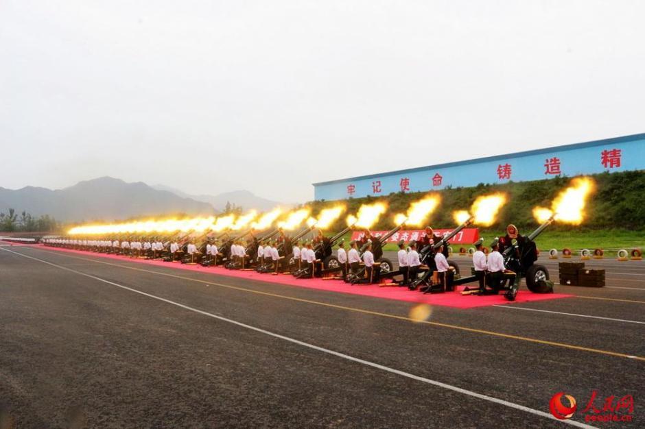 礼炮鸣放是9月3日阅兵活动的开篇之作。万众瞩目下,不能有半点瑕疵。尽管担负这次礼炮鸣放任务的武警礼炮部队官兵,已经多次执行过高规格的任务,但他们在训练中依然严格苛刻、精益求精。在北京某部训练场,56门庆典礼炮呈“八”字形列阵东西两侧。“以往我们在庆典活动中所使用的是94式庆典礼炮,由两名炮手立姿操作,一炮手负责开栓,二炮手负责装弹。今年我们所使用的是新装备的15式庆典礼炮,将由三名炮手跪姿操作,这将意味着训练难度也将大大增加。”负责此次鸣放任务的祖东阁方队长介绍说。