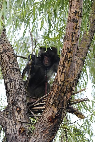 空军某场站,驱鸟队的猕猴在树上拆鸟窝以避免飞鸟影响飞行安全。王善君 摄
