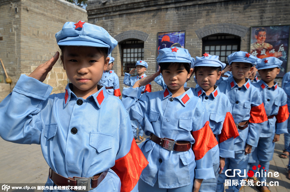 2015年08月25日,河北省邯郸市邯郸县南吕固乡中心小学组织小学生到该县四留固村参观“百年电影博物馆”,迎接“中国人民抗日战争暨世界反法西斯战争胜利70周年”。 同学们摆成“70”字样。图片来源:郝群英/CFP
