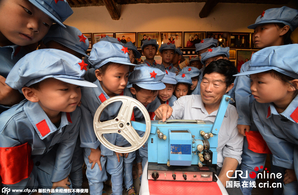 2015年08月25日,河北省邯郸市邯郸县南吕固乡中心小学组织小学生到该县四留固村参观“百年电影博物馆”,迎接“中国人民抗日战争暨世界反法西斯战争胜利70周年”。 8月25日,河北省邯郸市邯郸县四留固村“百年电影博物馆”的收藏者魏少先为同学们讲解老式放映机。图片来源:郝群英/CFP