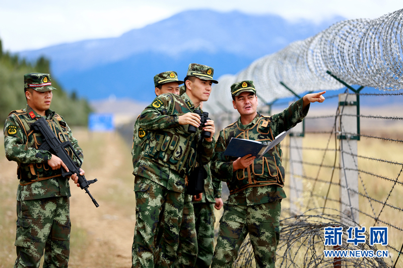 边防官兵在边境线附近勘察边境状况