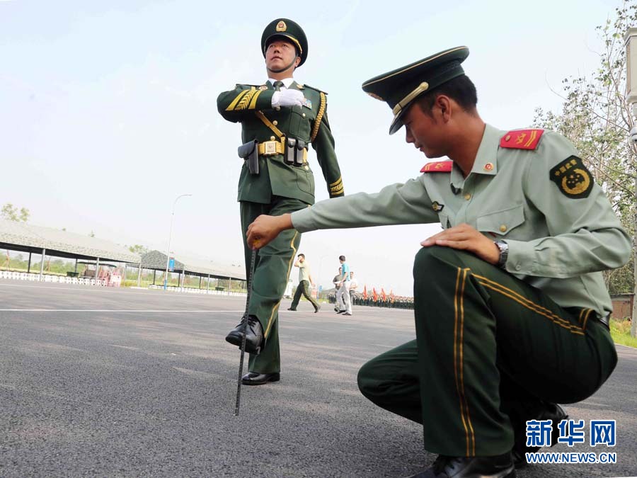 教练员拿着尺子测武警部队抗战英模部队方队领队、北京总队副政治委员苟春燕少将正步踢腿的高度。郑光傲摄