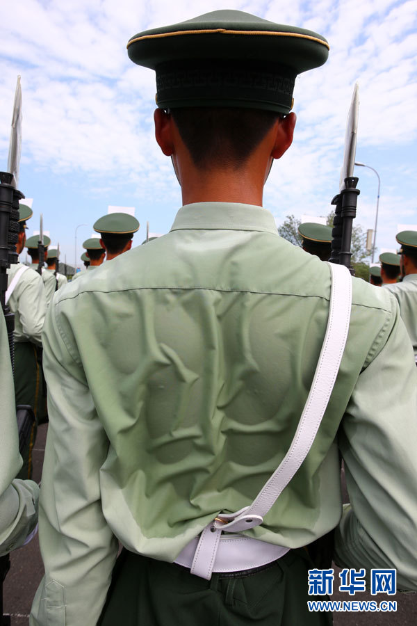 武警部队抗战英模部队方队官兵在阅兵训练基地进行训练(7月24日摄)。新华社记者 查春明 摄