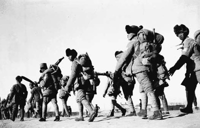 紧急奔赴绥远前线的中国士兵(摄影) 方大曾